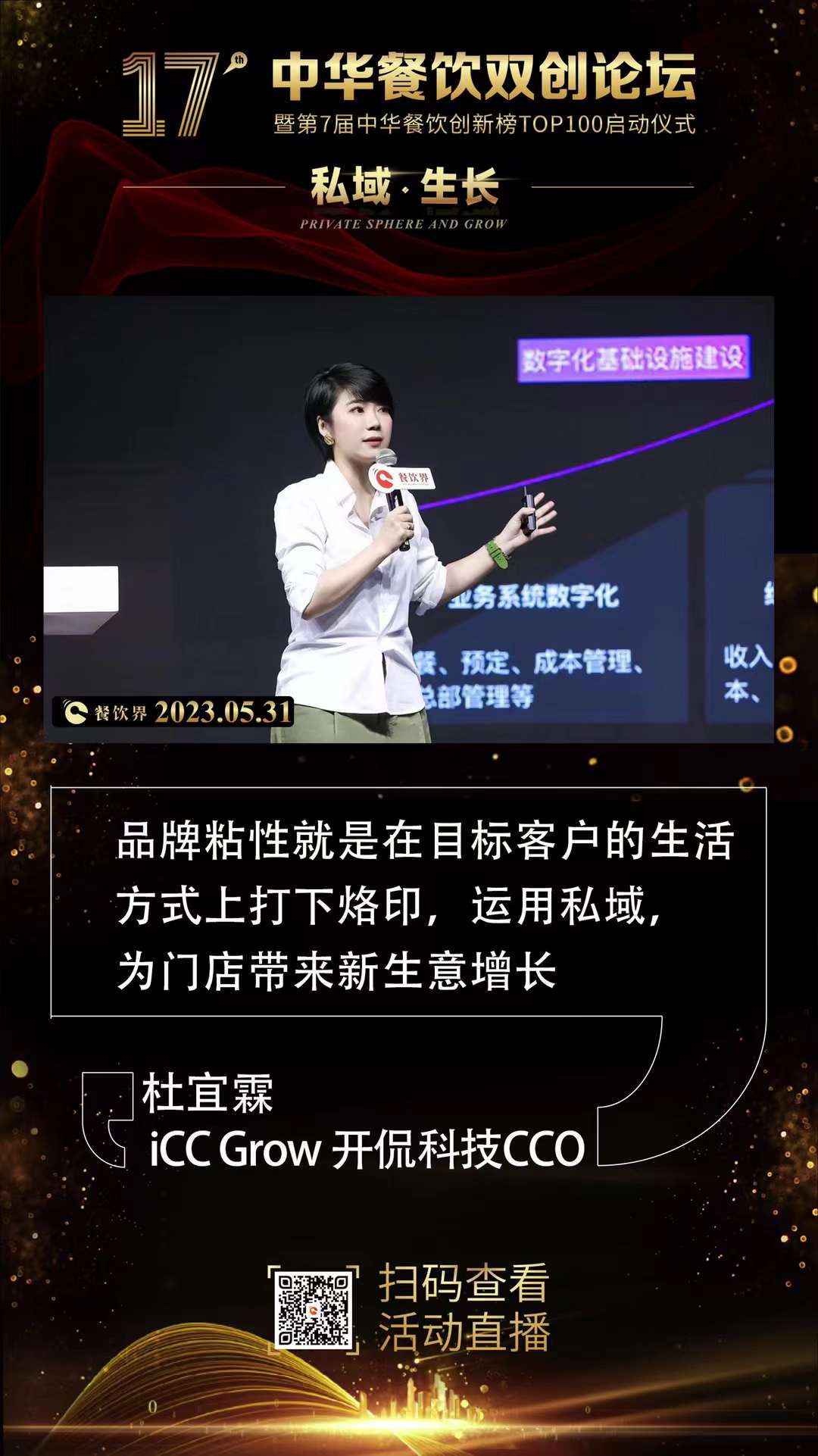 5月31日,由《餐飲界》新媒體、上海博華主辦的2023第17屆中華餐飲雙創(chuàng)論壇于上海國(guó)家會(huì)展中心隆重開幕,會(huì)議邀請(qǐng)了25+餐飲頭部重磅嘉賓,超100家餐飲品牌,共啟2023餐飲“私域·生長(zhǎng)”密碼。