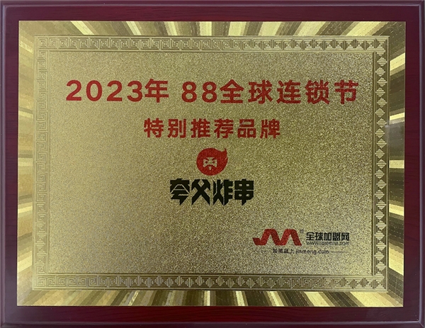 今年8月舉辦的“全球連鎖節(jié)高峰論壇”上,夸父炸串榮獲“特別推薦品牌”獎(jiǎng)項(xiàng),體現(xiàn)了夸父炸串在加盟創(chuàng)業(yè)項(xiàng)目中的綜合優(yōu)勢,是創(chuàng)業(yè)加盟的首選品牌。