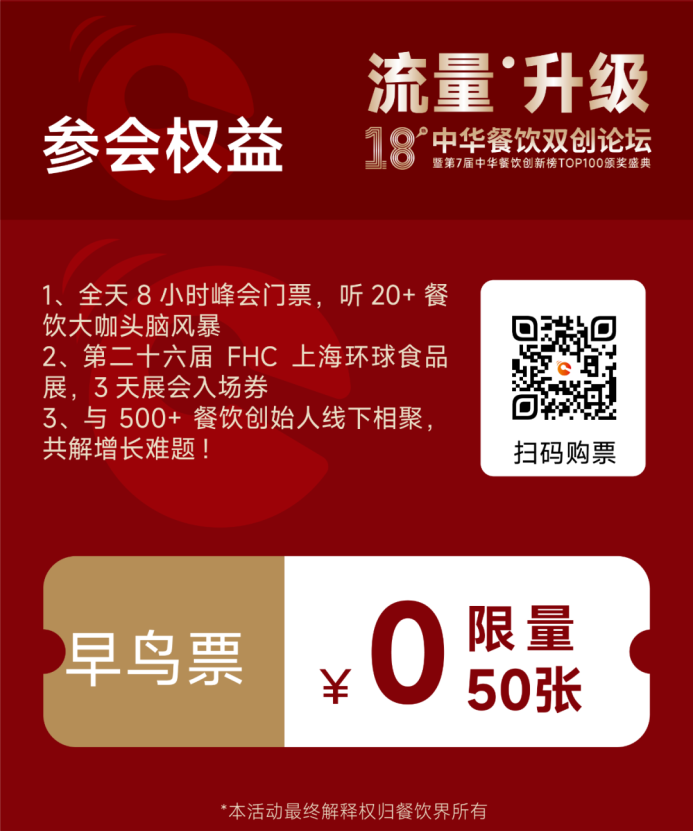 和頭部品牌創(chuàng)始人共話“流量·升級”,一起探尋增長之道,第18屆中華餐飲雙創(chuàng)論壇暨第7屆中華餐飲創(chuàng)新榜TOP100頒獎盛典報名通道已開啟!