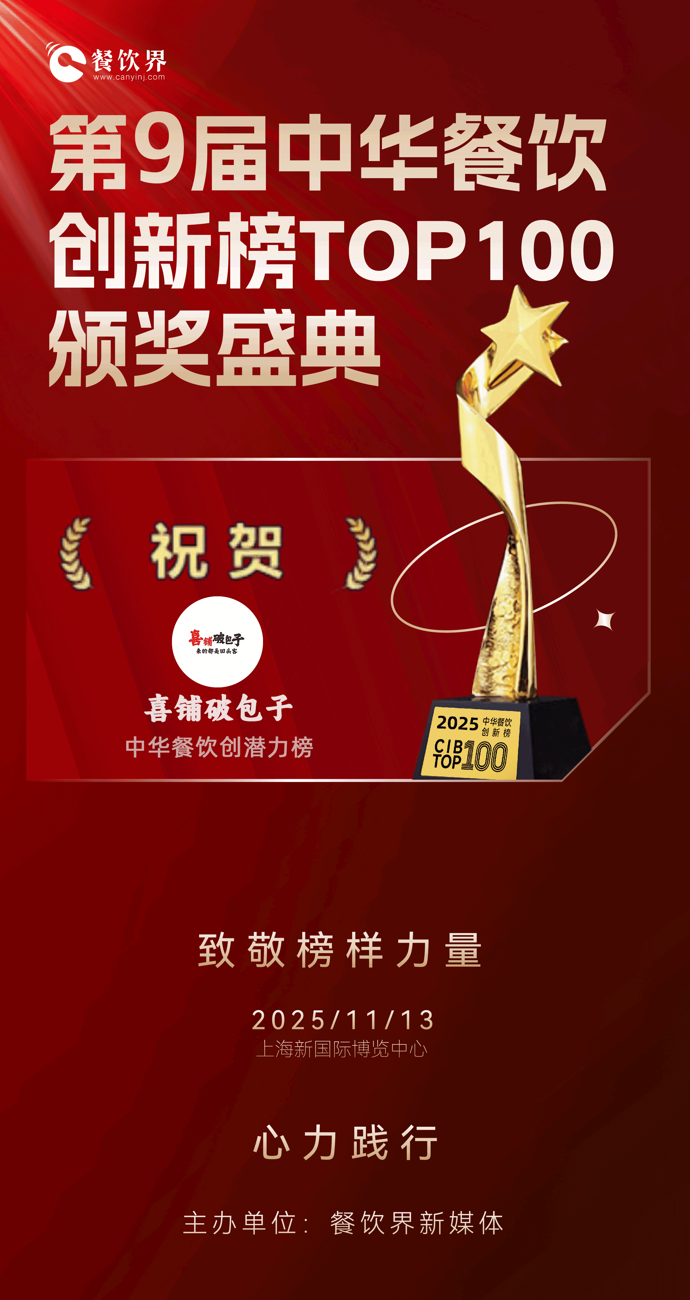 2025年11月13日,由《餐飲界》新媒體、博華展覽聯(lián)合主辦的2025第22屆中華餐飲雙創(chuàng)論壇于上海新國際博覽中心圓滿落幕,同期舉行的第9屆中華餐飲創(chuàng)新榜TOP100頒獎典禮上,破圈(沈陽)餐飲管理有限公司旗下核心品牌“喜鋪破包子”憑借在餐飲創(chuàng)新領(lǐng)域的突出實踐與發(fā)展?jié)摿Γ晒θ脒x“創(chuàng)新潛力榜”,成為中式快餐賽道創(chuàng)新標桿企業(yè)。