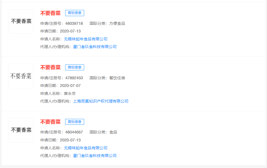 8、“不吃香菜”商標(biāo)被多方申請(qǐng)注冊(cè)商標(biāo)