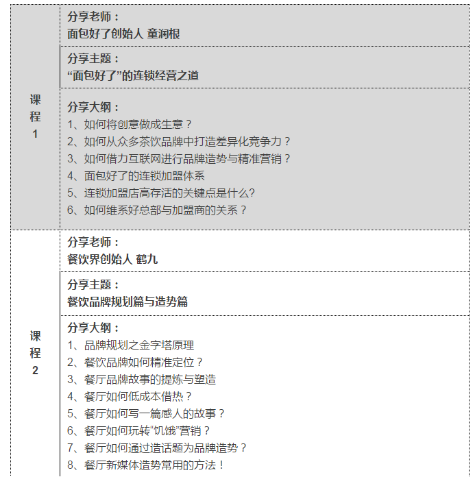 本期創(chuàng)新營(yíng)將邀請(qǐng)4位在品牌塑造和連鎖經(jīng)營(yíng)上頗有心得的業(yè)內(nèi)人士參與,從餐飲品牌規(guī)劃、餐飲品牌造勢(shì)、連鎖體系、連鎖餐飲品牌經(jīng)營(yíng)之道等角度,全面覆蓋連鎖營(yíng)銷關(guān)鍵點(diǎn)。