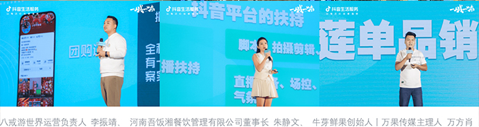 活動現(xiàn)場,三位品牌代表的干活分享和技能點拉滿收獲陣陣掌聲。作為商家,更需要具備的是了解達人市場,找到好的達人,用好達人。八戒游世界運營負責人李振靖代表服務商現(xiàn)身說法商家如何在抖音生活服務業(yè)務生態(tài)體系中,借力達人實現(xiàn)品效合一,提升GMV。河南吾飯湘餐飲管理有限公司董事長朱靜文從打造個人IP,從內(nèi)容破圈,放大餐飲新能量。牛芽鮮果創(chuàng)始人丨萬果傳媒主理人萬方肖分享了一家鮮果店從0-1的抖音經(jīng)營之旅,深挖線上陣地建設(shè)過程中的困難、經(jīng)驗、思考,為更多同行提供實戰(zhàn)經(jīng)驗。