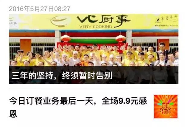 5月27日,立志做“餐飲界京東”的外賣店VC廚事在公眾號上發(fā)表聲明:轉(zhuǎn)讓300平米的中央廚房,公司也打包出售。