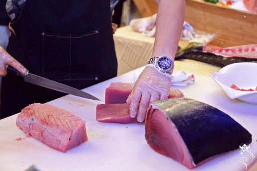開魚秀的主角大目金槍魚,更是從太平洋遠(yuǎn)道而來。大目金槍魚生活在水深100-400米的大洋深處,是金槍魚中的一個類別,與藍(lán)鰭金槍魚相似。嘗過大目金槍魚的都知道,其肉質(zhì)綿柔,口感更為軟嫩,是各大海鮮日料館選用最多的一種金槍魚。身為堂食刺身與外賣刺身專家更是必不可少了。開魚秀是由擁有豐富經(jīng)驗的大廚主持,看他熟練精準(zhǔn)的開魚刀法,也是一場盛大的視覺享受。