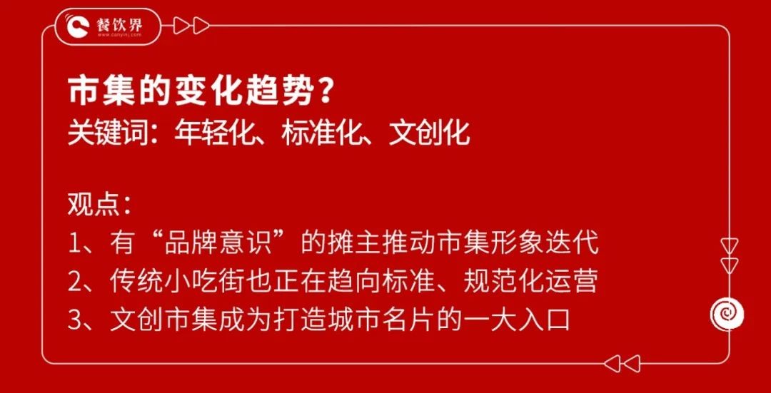 綜上,火爆市集的回歸,究根結(jié)底來(lái)自市場(chǎng)環(huán)境變化和消費(fèi)喜好變化的共同作用。從傳統(tǒng)市集到文創(chuàng)市集,從消費(fèi)鏈最底層到刷爆社交網(wǎng)絡(luò),市集在變化中經(jīng)歷著自我迭代。餐飲界(canyinj.com)觀察到,在這個(gè)過(guò)程中,市集有著明顯的三大變化