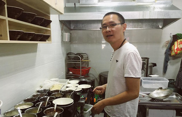見到汪巍的時(shí)候,他正坐在自己的面館里忙著接外賣訂單,此時(shí)還沒到飯點(diǎn),客人不多。店